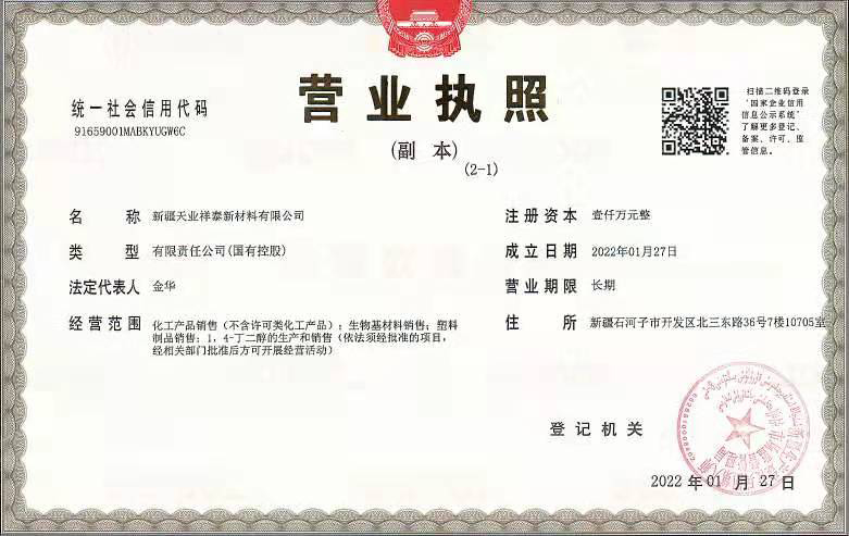 新疆天業(yè)祥泰新材料有限公司由東華科技與新疆天業(yè)(集團)有限公司共同設(shè)立,注冊資本金1000萬元,其中東華科技持股49%。經(jīng)營范圍包括化工產(chǎn)品銷售(不含許可類化工產(chǎn)品)、生物基材料銷售、塑料制品銷售、1,4-丁二醇的生產(chǎn)和銷售等業(yè)務(wù)。
